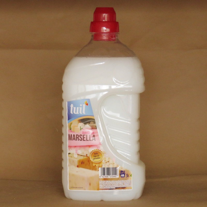 Suavizante Textil de 2 litros con aroma fresco a Jabón de Marsella que deja la ropa muy suave. Producto muy eficiente tanto para Lavanderias como para el Hogar.