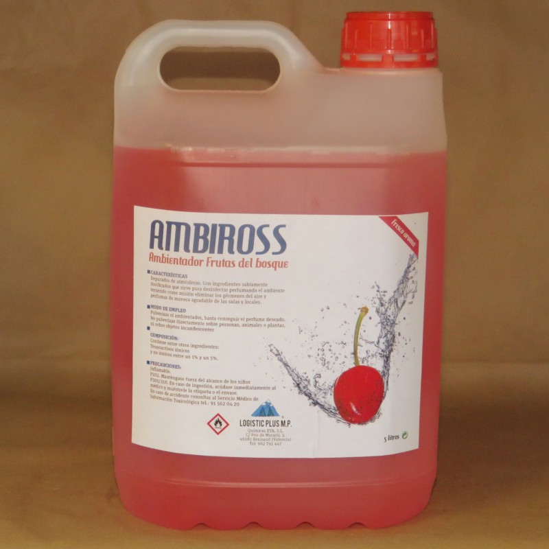 Ambibross es un Ambientador Liquido concentrado con aroma a Frutos del Bosque. Tiene un aroma fresco y duradero que además no mancha. Es un concentrado que se utiliza mayoritariamente en Empresas de limpieza por su eficiencia y durabilidad. Mayoritariamente se distribuye en formato 5 litros.